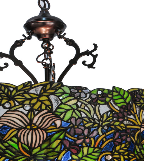 Occasional red-berry jewels highlight the fabulously ornate green leaves, purple violets, ivory trillium, and gold stems that form the wild riot of flowers gracing the deep blue background of this domed Trillium and Violet Inverted Pendant shade. A delicately curved support that looks a bit like briar, is finished in Mahogany Bronze. This gorgeous pendant lamp takes three 60-watt bulbs.